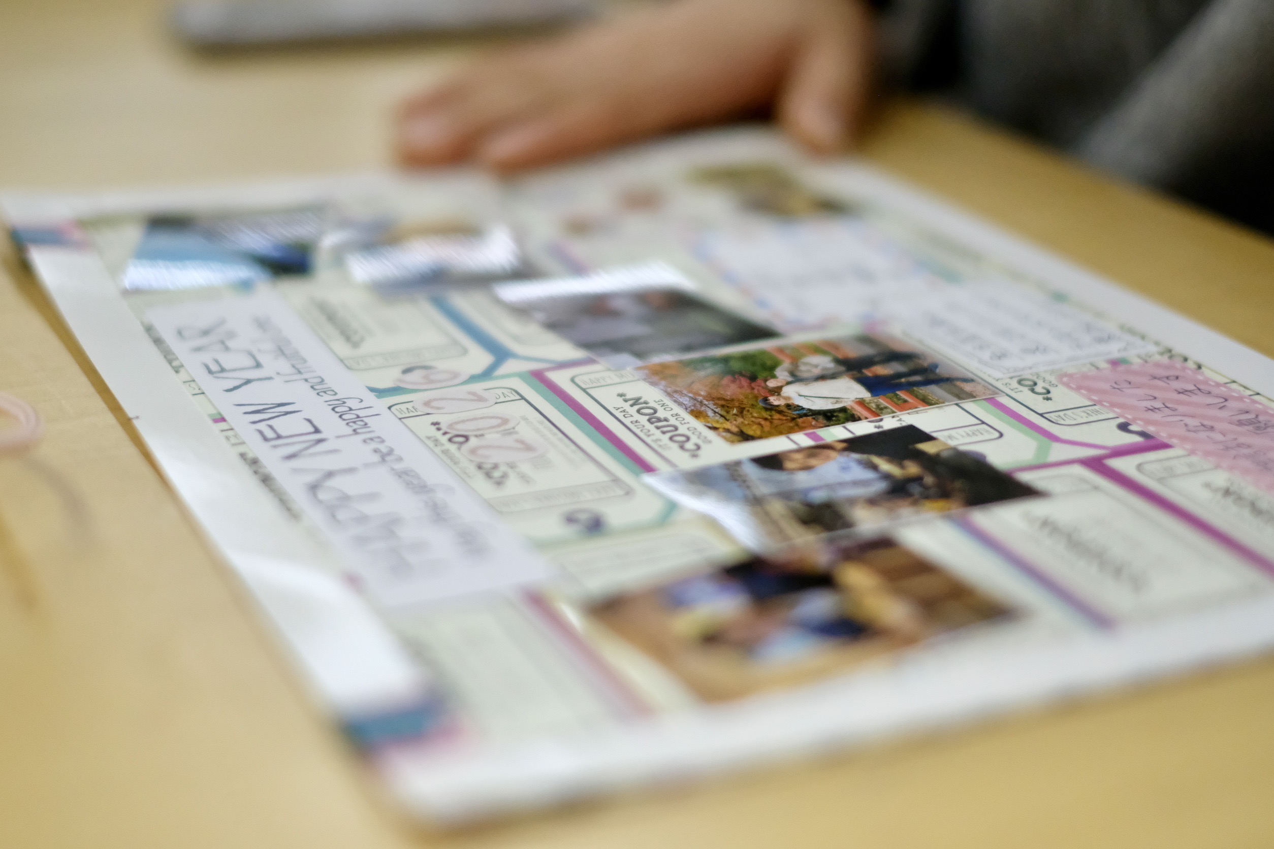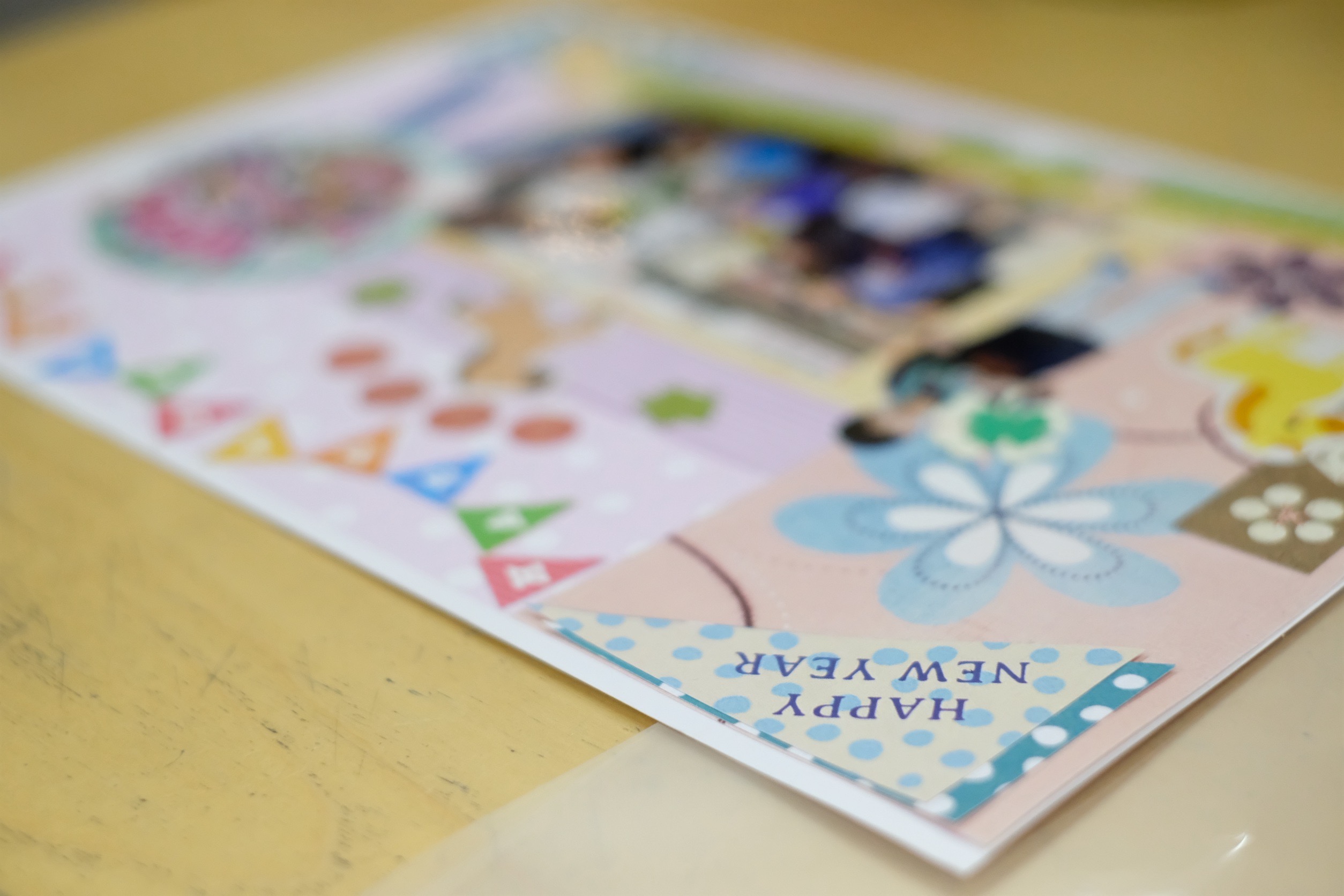 ①たくさんご用意している素材の中から、自分の好きなパターンペーパー、タイトル、干支、飾りパーツなどを選ぶ